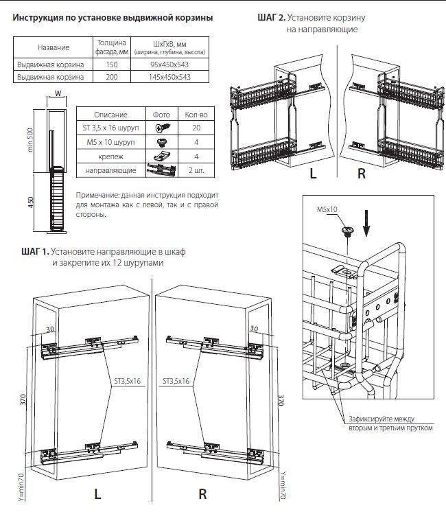 Выбирая карго, следует учесть габариты конструкции и короба, в который она будет вмонтирована. Корзина должна быть меньше внутренней ширины фасада, рабочей тумбы или верхнего шкафа