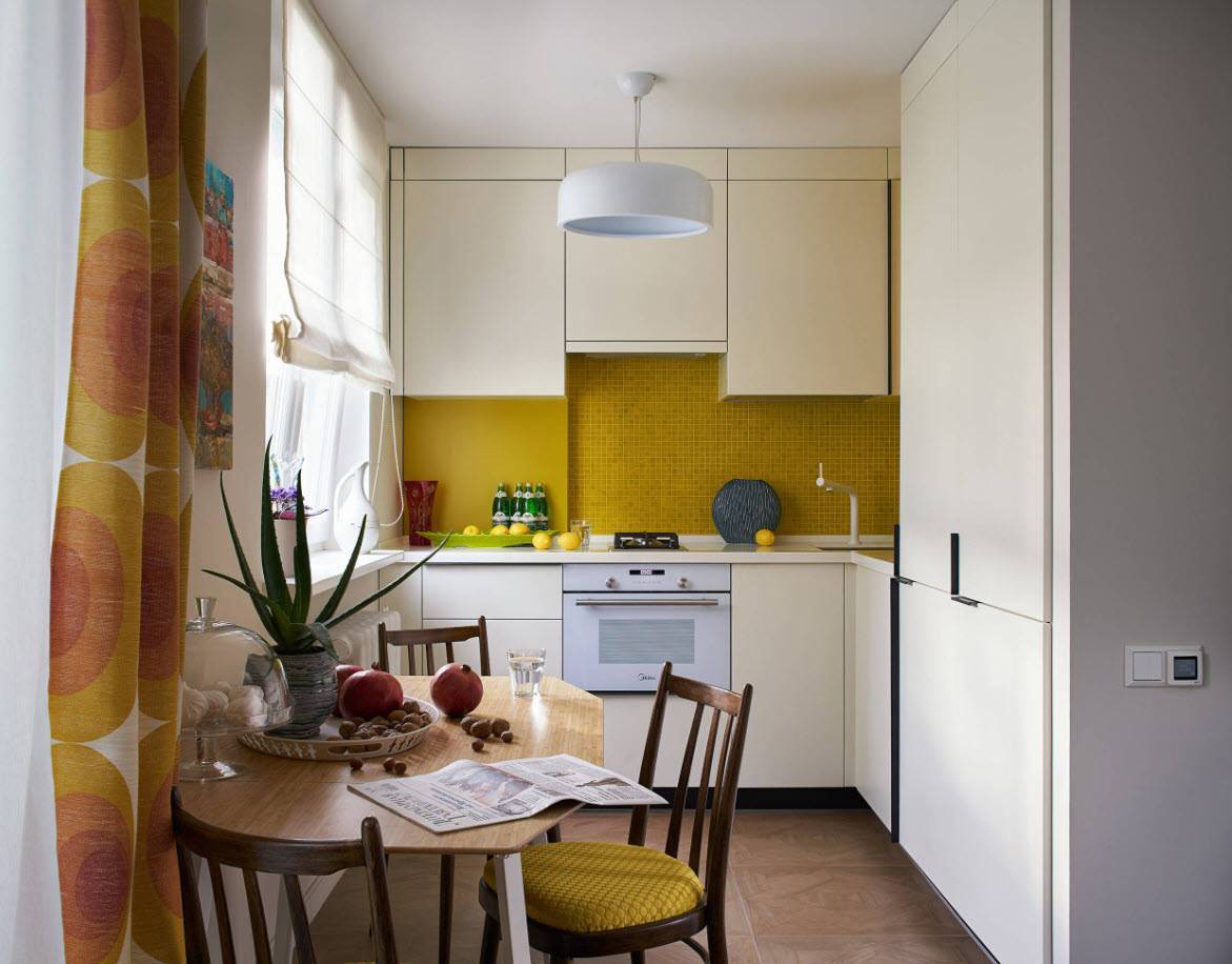 Маленькая кухня предполагает использование светлых палитр, спокойного, ненавязчивого тона. Пастельные и светлые оттенки рекомендуются для небольшой площади, чтобы визуально создать эффект простора и расширить стены.