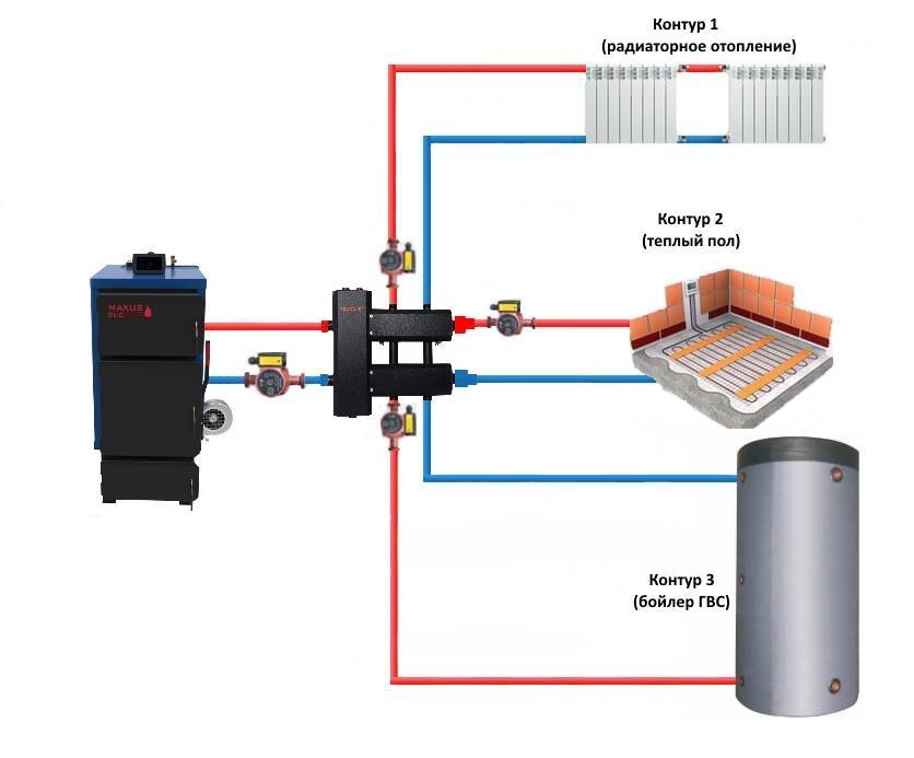 - Несколько вторичных контуров отопления (например, на группу комнат или на этаж).