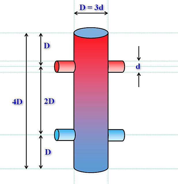 С диаметром гидроразделителя для отопления определились, но надо знать еще и длину. Ее подбирают в зависимости от диаметра подключаемых патрубков. Есть два вида гидрострелок для отопления — с отводами, расположенными один напротив другого и с чередующимися патрубками (располагаются со сдвигом один относительно другого).