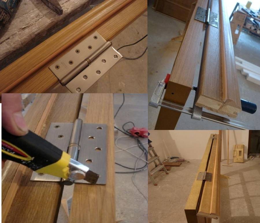 - Подравнивание с помощью стамески скрепляемых поверхностей, затем их фиксация на саморезы. В таком случае появляется дополнительный этап, так как после наметки отверстий для саморезов, их раскручивают для установки петель.