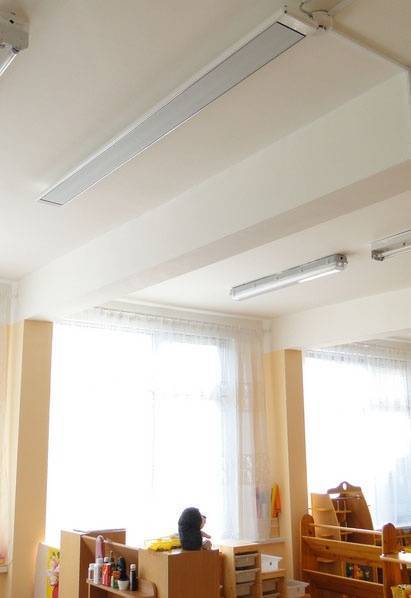 Потолочный вариант лампового или плёночного типа – идеальный прибор для установки в крупных помещениях с расстоянием до пола 3 метра и более. Такие модели часто устанавливают в гаражах, сервисах, складах, спортзалах, медицинских кабинетах и т. д. Кроме того, что прогрев получается равномерный, экономится место и не страшно быстрое выветривание, если в общественном месте часто ходят люди, открываются-закрываются двери.
