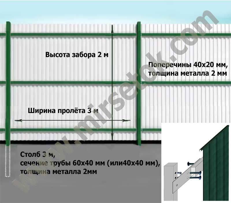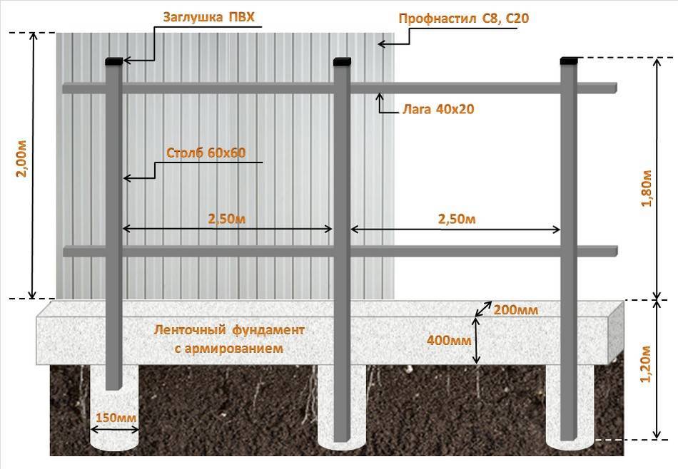 Количество опор зависит от расстояния между столбами забора из профнастила