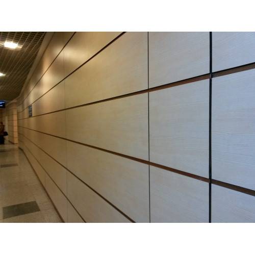 - Отбойная доска. Это негорючая панель, сверху покрытая HPL, который относится к группе трудно горючих. Торцы панелей так же защищены. Доска имеет высокие эстетические параметры, включая текстуры ценных пород древесины. Она гигиенична, огнестойка, влагостойка, экологична. Ее можно устанавливать в ДОУ, на спортивных объектах, в общественных местах.