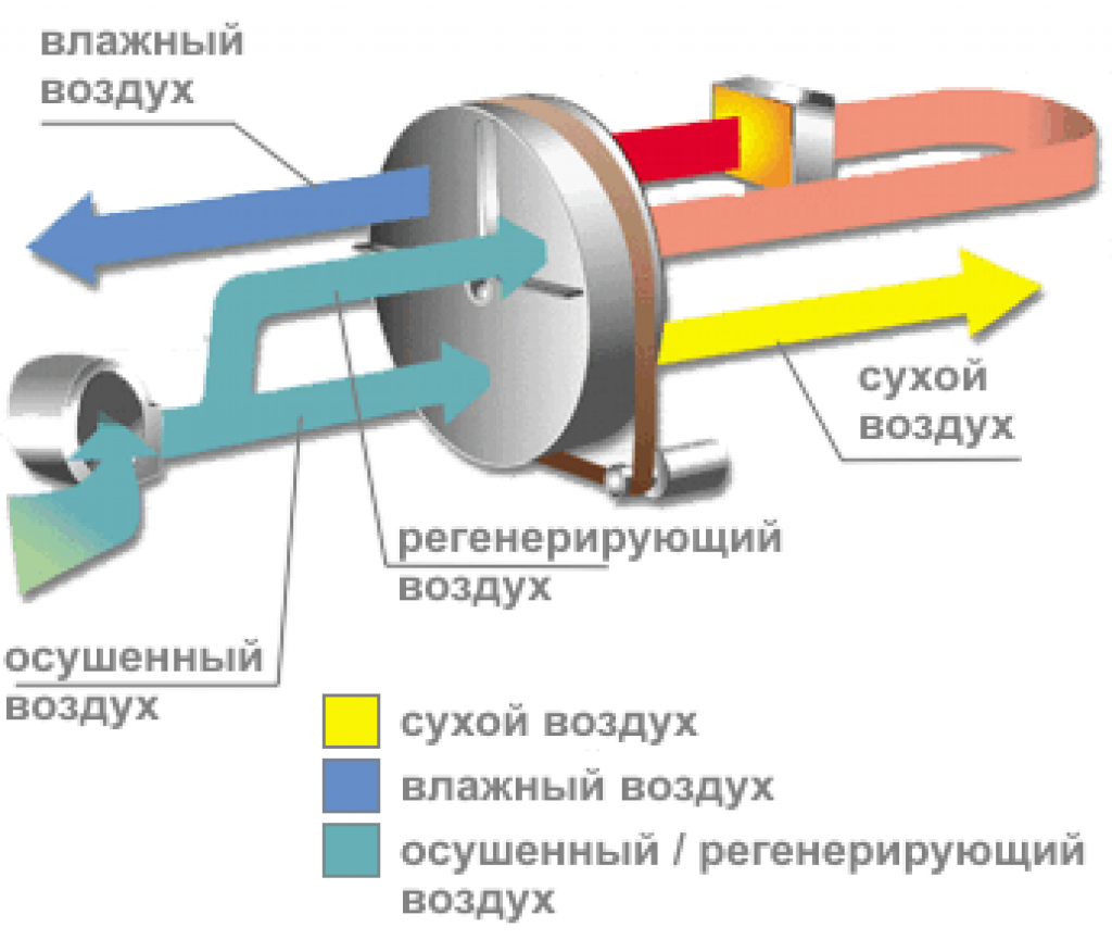 Барабан прибора постоянно находится в действии, именно через него в систему проникают потоки воздуха. Лишний водяной пар впитывается силикагелем, а высушенный воздух возвращается в помещение. Для удаления влаги, накапливаемой в адсорбенте, отделяется часть воздуха, которая затем проходит через встроенный нагревательный элемент, повышающий его температуру до 140 °С. Именно такая температура требуется для восстановления свойств силикагеля.