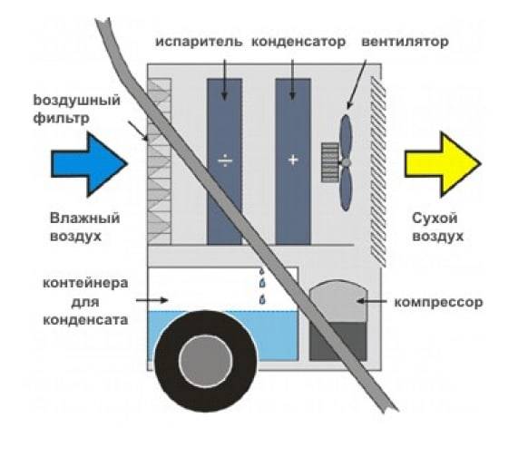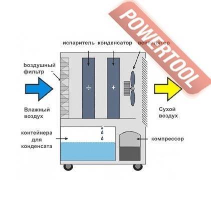 Допустим, самый оптимальный вариант – конденсационный осушитель, который работает по принципу кондиционера. Как уже описывалось выше, он поглощает влажный воздух и выдаёт сухой. Но беда его в том, что им никак нельзя пользоваться при минусовых температурах! А это значит, что в странах с суровым климатом и длинными зимами, такой вариант — сезонная вещь.