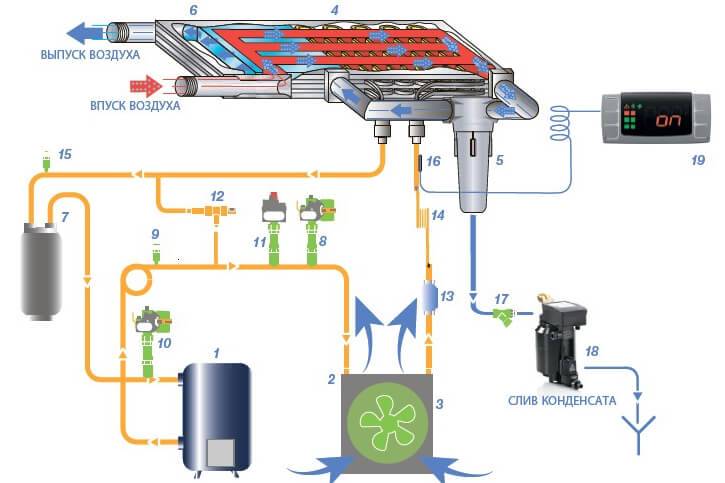 - Сжатый воздух проходит через рефрижераторный теплообменник и охлаждается, достигая температуры конденсации. Циркуляцию хладагента обеспечивает компрессор. Оставшаяся влага в сжатом воздухе охлаждается, достигая давления конденсации, и автоматически удаляется.