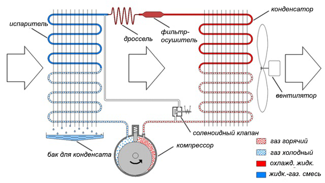 Принцип работы осушителя отличается от действия влагопоглотителя и показан на рис. 3. Воздух последовательно проходит через охладитель и нагреватель, теряя влагу при понижении температуры; при нагревании воздух имеет уже относительно меньшую влажность.