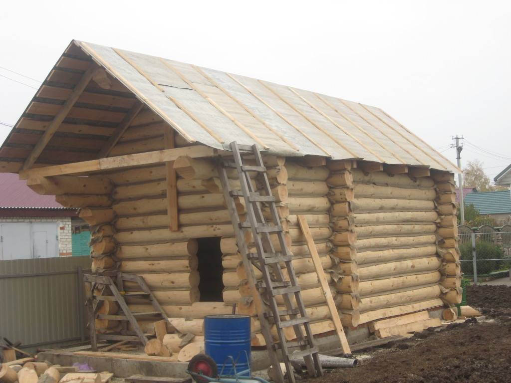 Шаг 6. Подняв стены на нужную высоту, уложите поверх них потолочные балки и стропила. Если использовалась влажная древесина, то вместо стропил уложите листы шифера и дождитесь усадки конструкции. Обычно для этого достаточно один раз перезимовать, но в идеале усадка должна длиться год-полтора.
