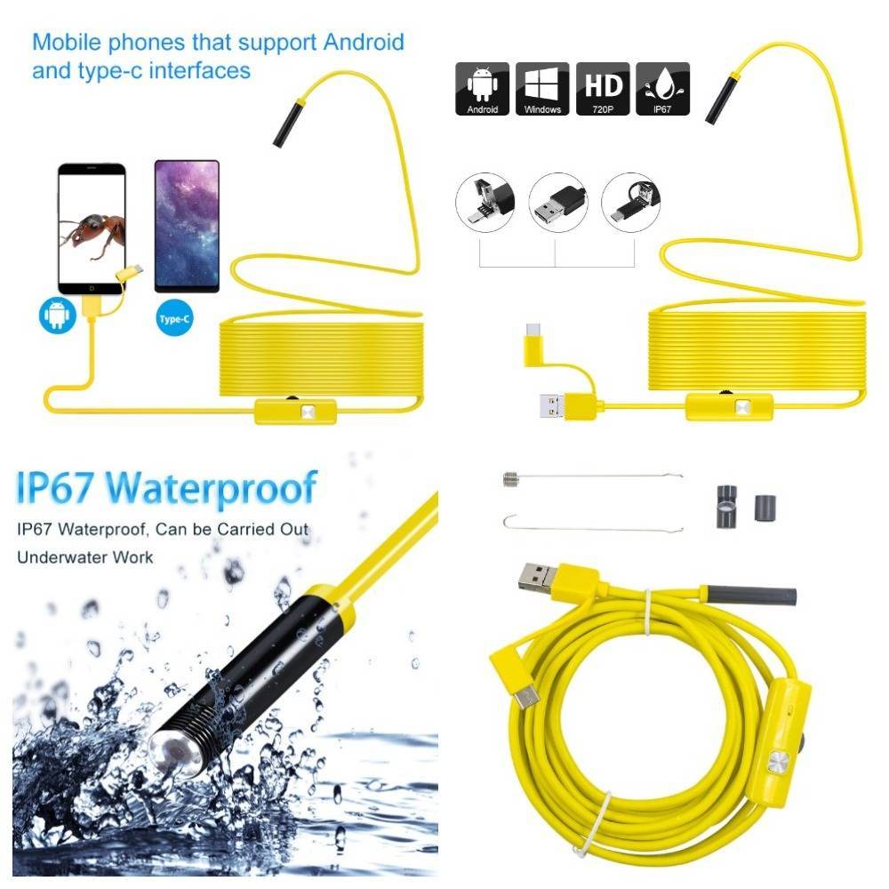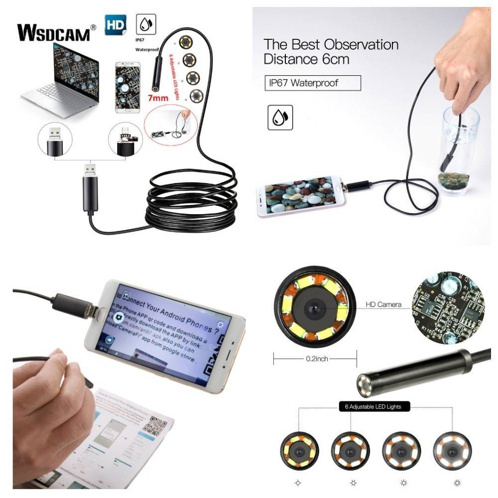 Бюджетный девайс с подключением к смартфону на Android комплектуется камерой 5.5 или 7 мм, кабелем 1-2 м и насадками — зеркалом, спиралью и крючком. Обладает углом обзора 66 градусов и предоставляет стандартное изображение 640 на 480. Поставляется в водонепроницаемом корпусе, отличается долговечностью.