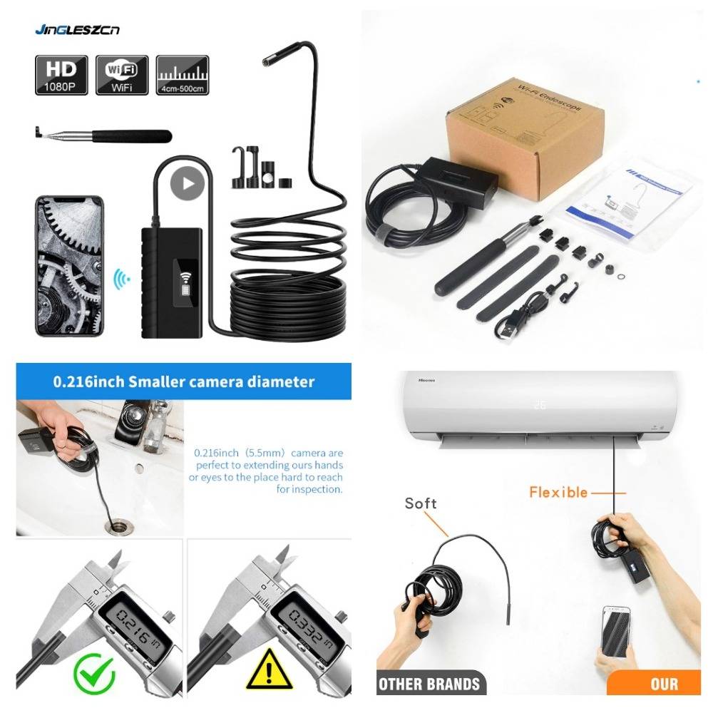 Эндоскоп с подключением к смартфону по Wi-Fi работает от аккумулятора на протяжении 2 часов. Камера у устройства составляет 8 мм в диаметре, кабель гибкий, лучший фокус приспособление дает на расстоянии около 4 см от объекта. К минусам модели пользователи относят то, что картинка теряет четкость при большом приближении.