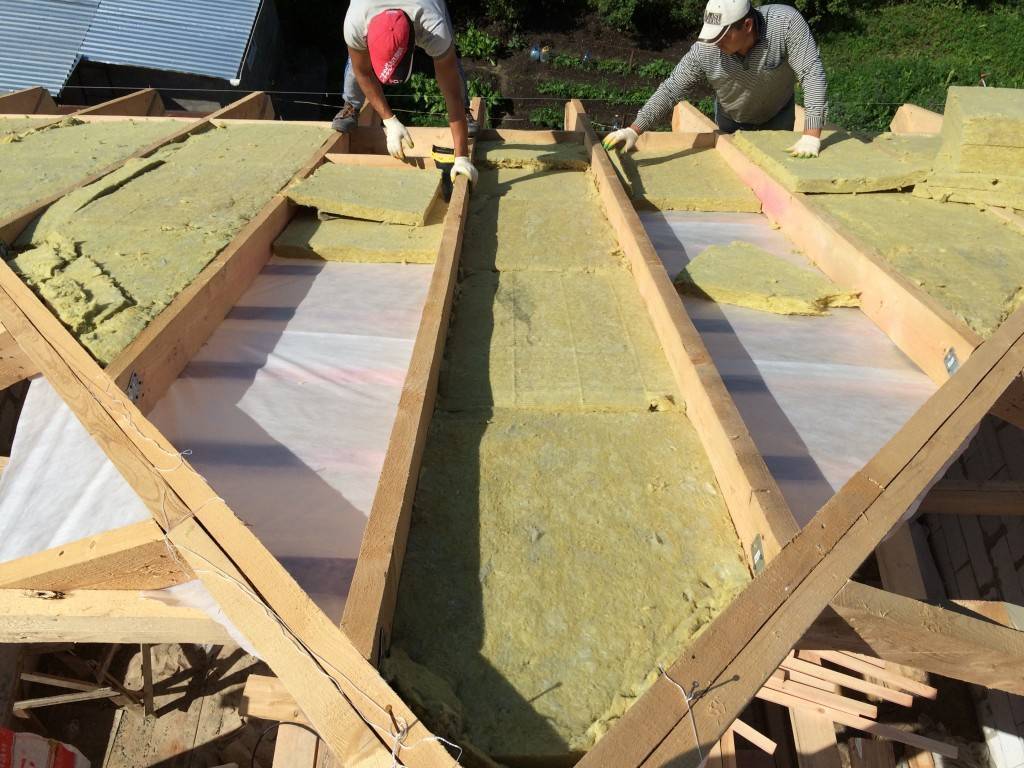 Следующий этап – закладка в зазоры между стропилами теплоизоляционного материала. Плиты рекомендуется подгонять по ширине меж стропильного проема, маты нарезаются на равные между собой куски.