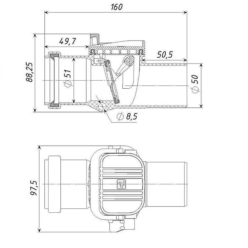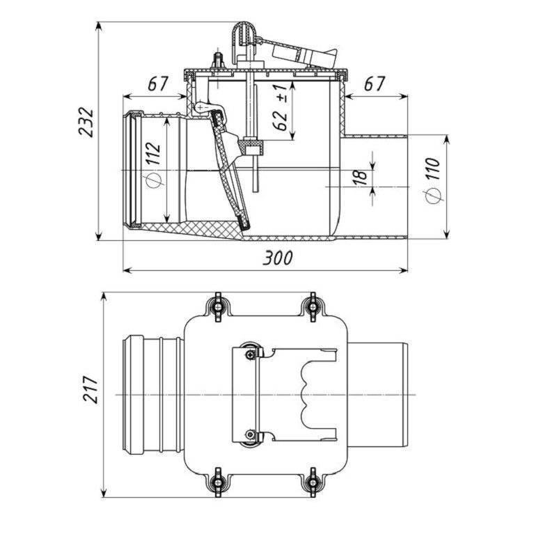 Само устройство имеет большие размеры, чем труба, на которую его устанавливают. Так что в трубопроводе идет сначала расширение, а затем сужение просвета, а это — потенциальные места образования засоров. Чтобы была возможность оперативно устранять засоры, в верхней части корпуса обратного клапана делают съемную крышку. Сняв ее проблему можно быстро устранить.