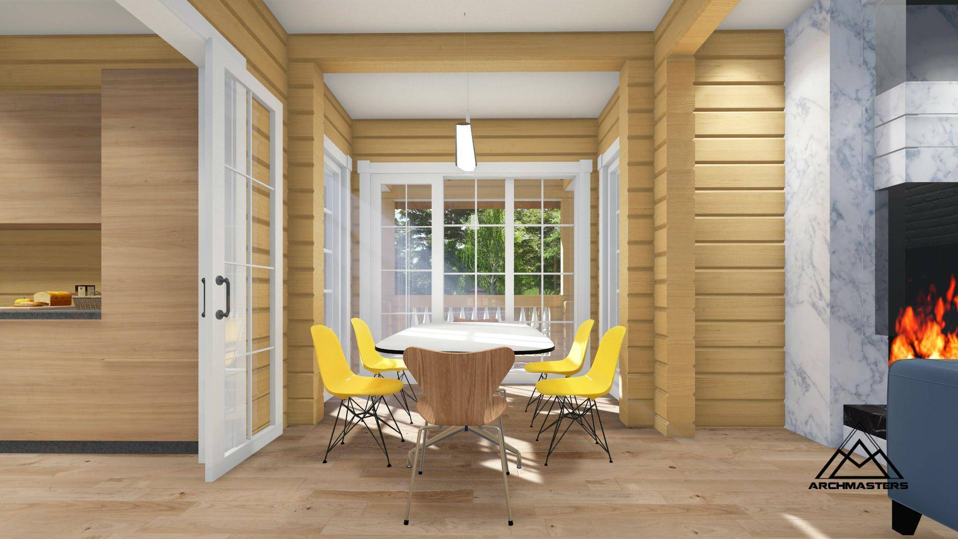Декоративный камень часто присутствует на отдельных элементах деревянного дома, акцентируя внимание на их важности в той или иной комнате. Такими покрытиями нередко выделяют стены возле камина или обеденные зоны